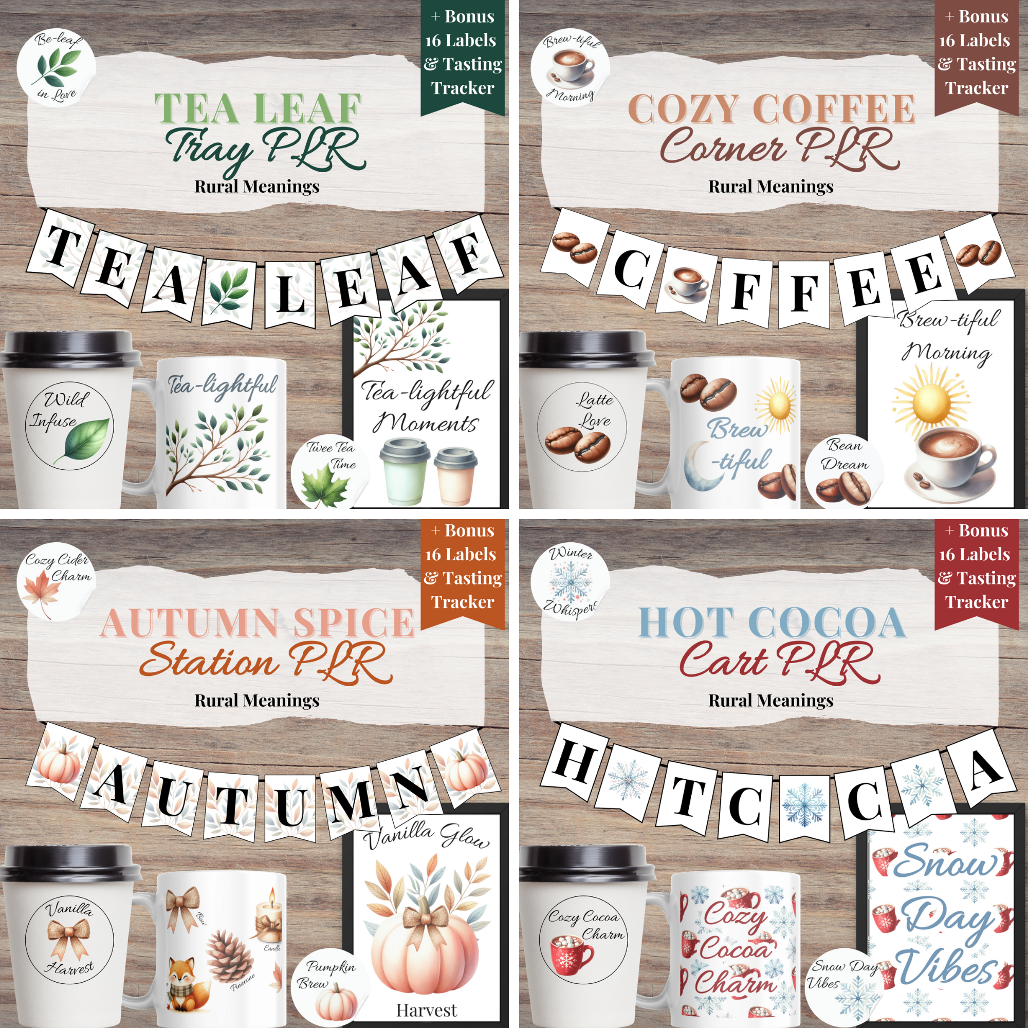 Wrap your audience in cozy charm with the PLR Brew-tea-ful Kit. It's a collection of PLR printable templates made for sipping, savoring, and celebrating the little moments. Whether it's a tea tray steeped in calm soothing energy, a buzzing coffee corner, a spiced autumn station, or a hot cocoa cart perfect for snowy days, each kit brings the charm of a cozy gathering to life. Inside, you'll find bunting banners, cup stickers, mug wraps, signage, labels, a tasting tracker, and matching seamless patterns. Everything you need to dress up a drink station with warmth and style. Give your customers a relaxing moment all without the hassle of starting from scratch. With PLR you can easily rebrand and make it your own!